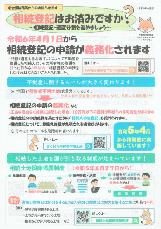 みなさまは相続登記はお済みですか? 令和6年4月1日から、相続登記の申請が義務化されます。 相続によって不動産を取得した相続人は、その所有権の取得を知った日から3年以内に相続登記の申請をしなければいけないことになりました。 ご不安なことはどうぞお気軽に、車道司法書士事務所にご相談ください。